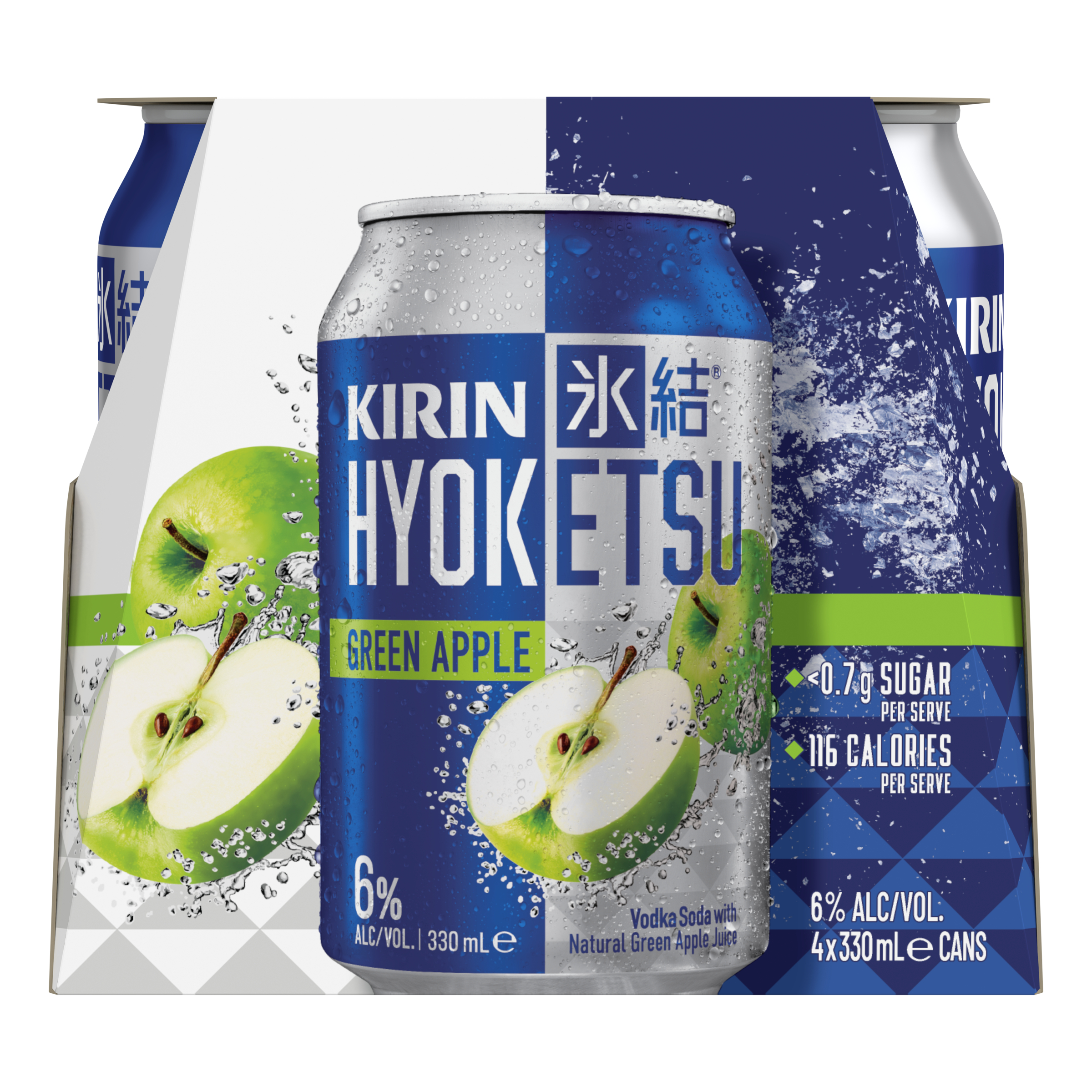 Kirin Hyoketsu Green Apple. Vodka, Soda and Natural Green Apple Juice. <0.7g of Sugar | 6.0% ABV | 116 Calories.